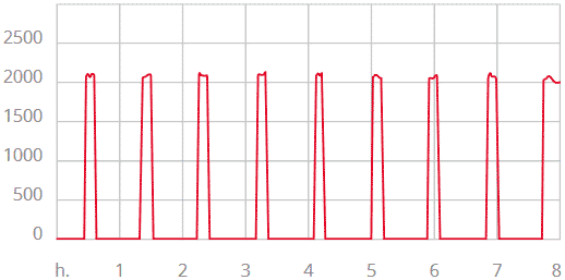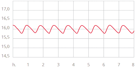 Production de chaleur et consommation d’énergie pendant 8 heures dans une pièce préchauffée. La courbe de température montre le développement de la chaleur à une hauteur de 1,2 m.